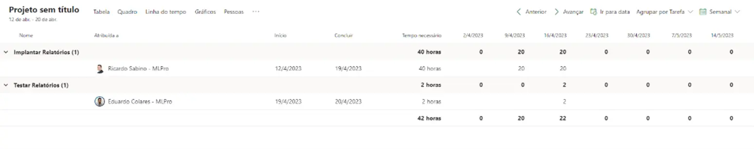 - Ao contrário do modo de exibição Grade, as colunas não são configuráveis. As únicas colunas visíveis são: Atribuído a, Nome da tarefa, Data de início e término da atribuição.